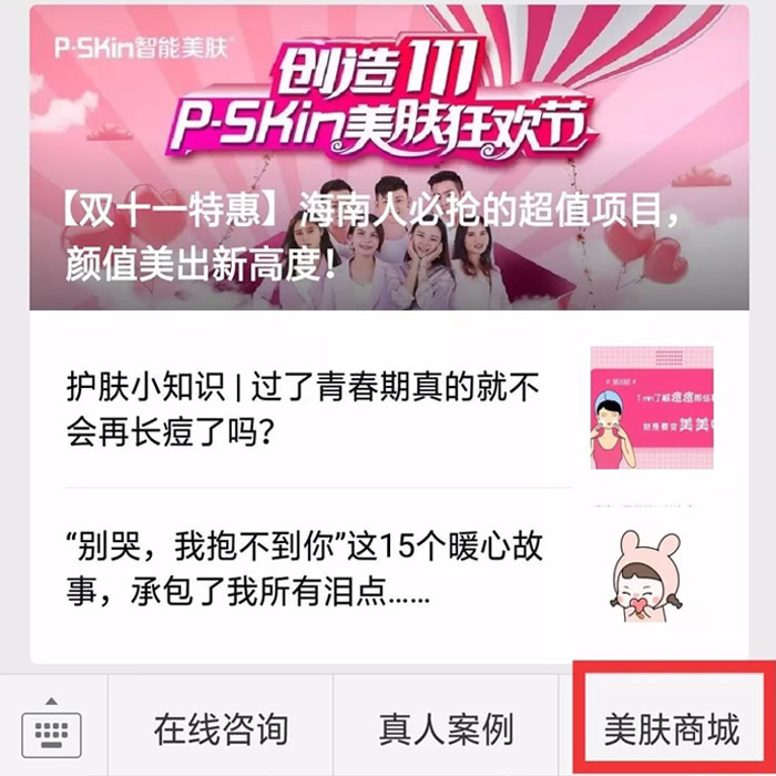 也可以在公众号首页进入“美肤商城”,在线抢购护肤套餐或者在后台留言咨询购买