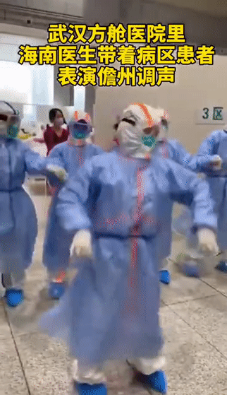 武汉方舱医院里,千里驰援的我省医护工作者,带着病区患者表演儋州调声,让欢乐的气氛抚慰患者,传递着对美好生活的热忱与期盼。