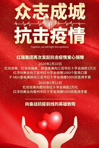 2020年2月10日,红瑞集团旗下红妆双美、红妆尚医美、颜值医美向三亚市红十字会捐款3万元。