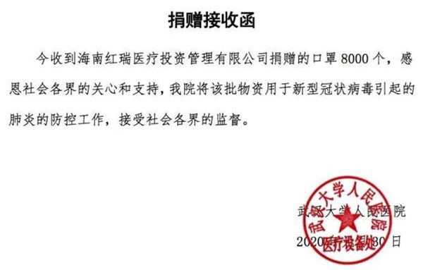 3月19日,红瑞集团为海南省人民医院、海南医学院第一附属医院、海口市人民医院、三亚市人民医院、三亚市中心医院、儋州市人民医院各捐赠100盒医用面膜。