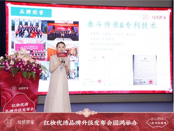 新品宣讲环节,红妆优绣技术总监冯晓琳老师上台分享,为全场嘉宾朋友展示红妆优绣的专利技术、品牌荣誉、三大技法等内容。她表示,此次新品研发,是以专业化、高端化、精品化为出发点,在工艺之道上更加注重艺术之美与人文之美合而为一,呈现出求美者期待的模样。