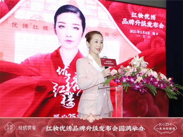 发布会上,红妆美业总经理符丁懿女士发表精彩致辞,她表示,此次品牌升级,红妆优绣将传承东方美学智慧,从经典文化中汲取灵感,取其韵味、意境,希望在技术与人文美学之间找寻共情关系。在团队经过无数次探讨后,发掘出“优绣红楼美人妆”的美学理念。